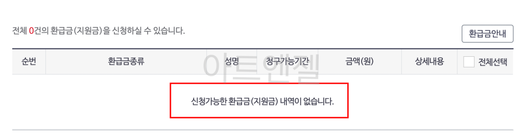 대상자가 아닌 경우에는 아래와 같이 “신청 가능한 환급금(지원금) 내역이 없습니다.”라고 내역이 표시됩니다.