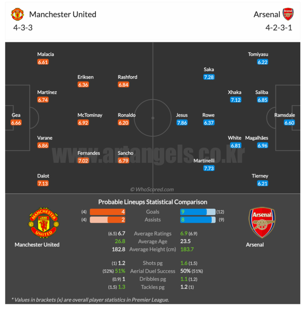 맨유 : 크리스티안 호날두, 산초, 래쉬포드, 페르난데스, 맥토미니, 달롯, 바란, 마르테니즈, 에릭센, 말라시아, 데헤아