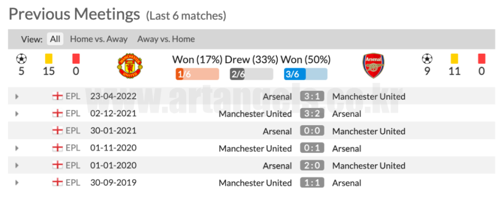 맨유는 아스날과 19경기 중 17경기에서 패배하지 않았습니다.
