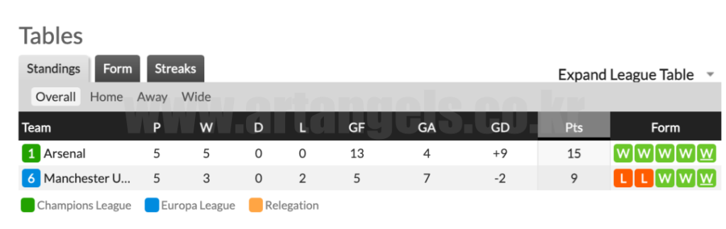 아스날은 5라운드 기준 5승 0패, 승점 15점으로 리그 1위를 기록하고 있습니다.