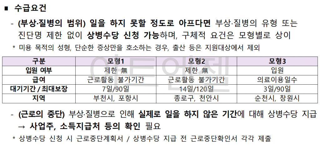 일을 하지 못할 정도로 아프다면 부상 및 질병의 유형 또는 진단명 제한 없이 상병수당 신청이 가능합니다.