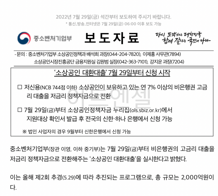 소상공인 대환대출 신청 방법과 각 대상에 따른 금리 자격 조건에 대해서 한번 알아보겠습니다. 중소벤처기업부는 7월 29일부터 비은행권의 고금리 대출을 저금리 정책자금으로 전환해주는 ‘소상공인 대환대출’을 실시한다고 공식적으로 발표했습니다. 이번 정책자금은 제2회 추경(5.29)에 따라 추진되는 프로그램으로, 총 규모는 2,000억원으로 예상됩니다. 이번 대환대출은 부채 상환부담으로 대환이 시급한 저신용 소상공인(NCB 744점 이하)을 우선 지원할 예정이며 별도 보증 없이 융자 방식으로 진행될 예정입니다. 자세한 내용은 하단에 정리해두었습니다.