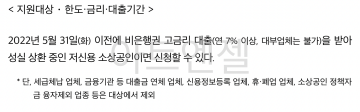 2022년 5월 31일(화) 이전에 비은행권 고금리 대출(연 7% 이상, 대부업체는 불가)을 받아 성실 상환 중인 저신용 소상공인 대상자입니다.