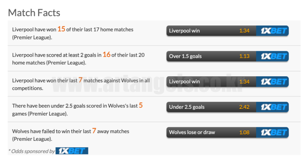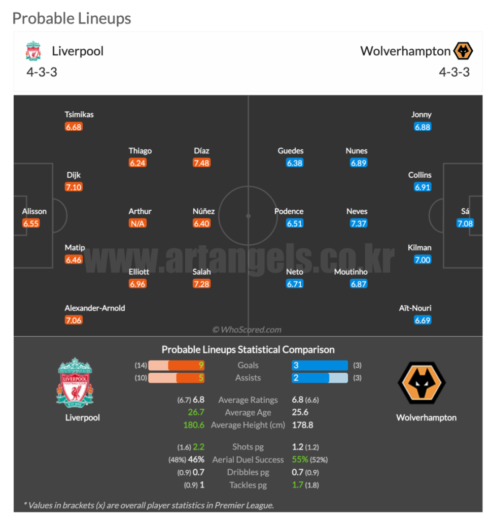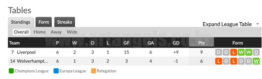 리버풀은 리그 2승 3무 1패를 기록하면서 리그 7위를 기록하고 있으며 울버햄튼 원더러스는 1승 3무 2패로 리그 14위를 기록하고 있습니다.