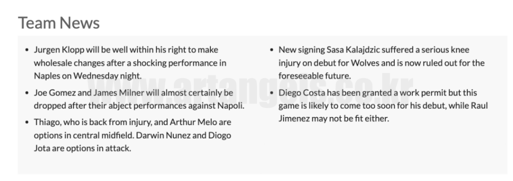 - 부상에서 돌아온 티아고, 아서멜로는 중앙 미드필더의 옵션이며 Darwin Nunez와 Diogo Jota는 공격 옵션이 추가될 수 있습니다.