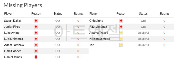 울버햄튼은 치퀴뉴, 라울히메네즈는 부상에서 제외되며 아담 트라오레, 넬센 세메도, 토디는 부상 의심으로 출전 여부가 불투명한 상태입니다.