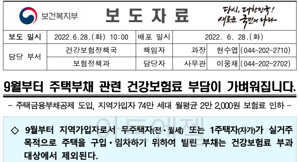 2022년 주택부채 건강보험료 공제 신청 방법에 대해서 한번 알아보겠습니다. 22년 9월부터 보건복지부에서는 주택부채 관련 건강보험료 부담을 줄이기 위한 목적으로 7월부터 주택부채 건강보험료 공제 신청을 받고 있습니다. 특히, 이번 주택부채 공제는 9월부터 지역가입자로서 무주택자 전세 또는 월세 또는 1주택자 자가이면서 실거주 목적으로 주택을 구입ᆞ임차하기 위하여 빌린 부채는 건강보험료 부과 대상에서 제외할 것으로 보입니다.