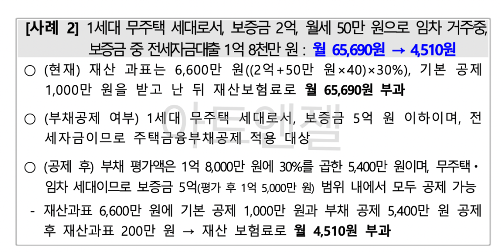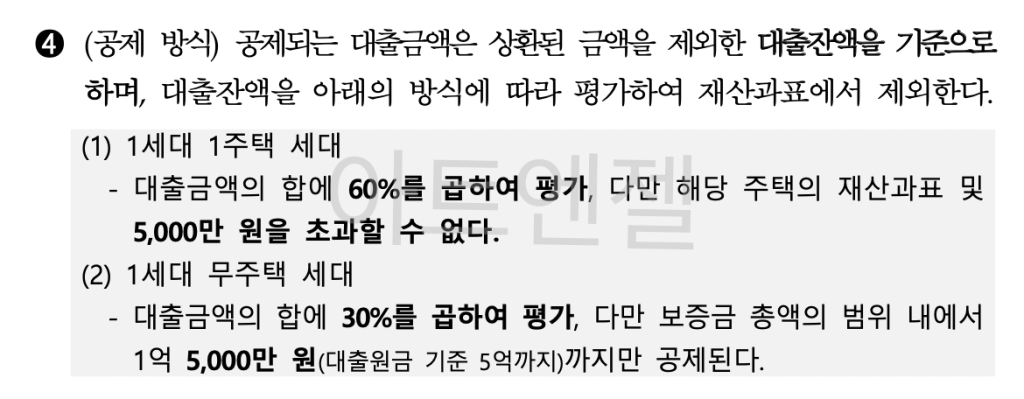- 1세대 무주택자는 대출금액 x 30%으로 평가하며 보증금 총액 범위에서 1.5억원까지만 공제됩니다.