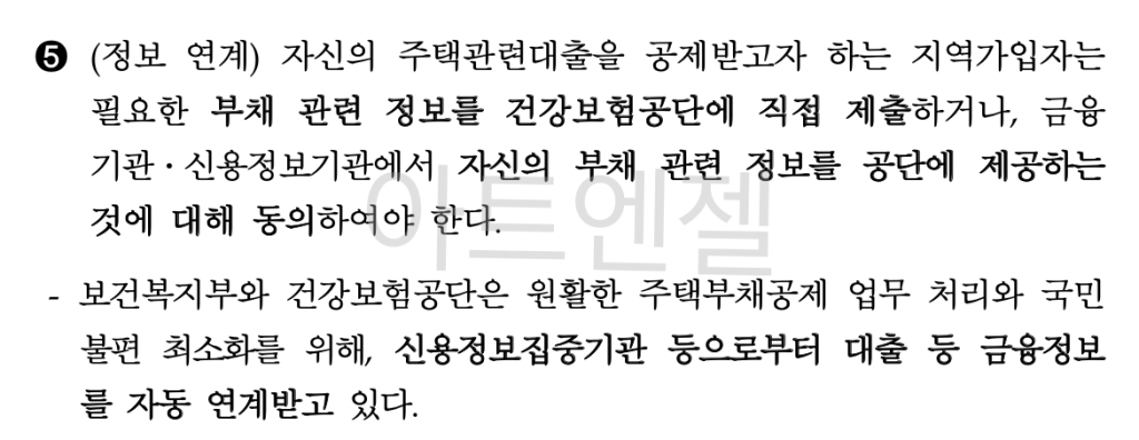 본인의 주택관련대출을 공제받기 위해서는 대상자는 필요한 부채 관련 정보를 건강보험공단에 직접 제출 또는 금융기관/신용정보기관에 자신의 부채에 대한 관련 정보를 공단에 제공하는 것에 동의해야 합니다.