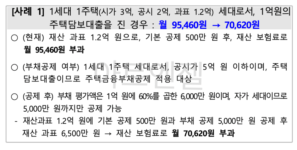 - 1세대 1주택자는 대출금액 x 60%으로 재산과표로 책정하며 최대 5천만원을 넘길 수 없습니다.