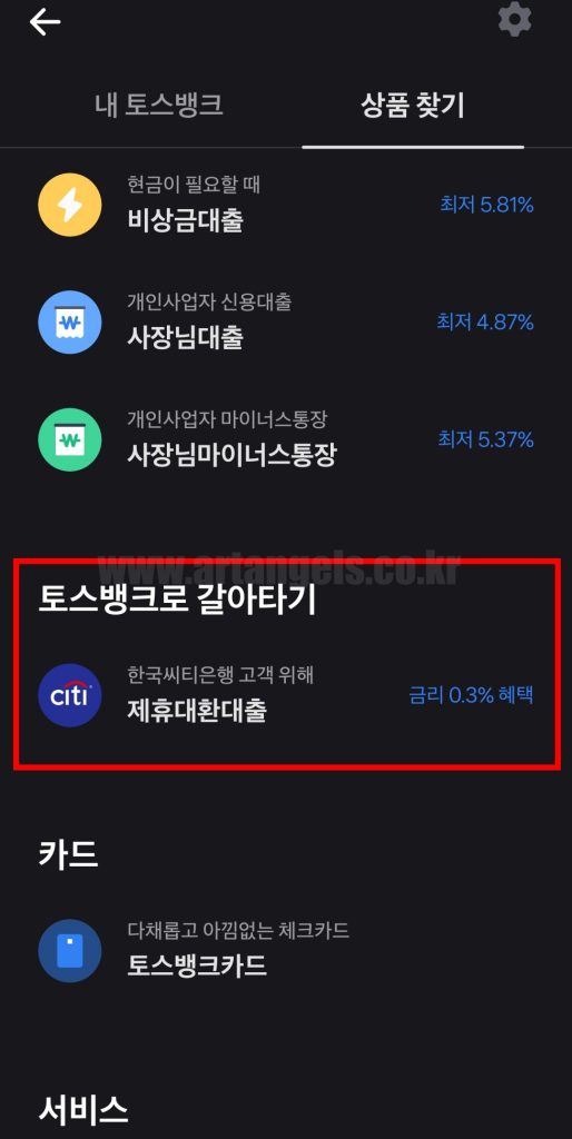 4. 상품찾기에 나온 대출 상품 중 토스뱅크로 갈아타기 한국씨티은행 고객을 위한 제휴대환대출 상품을 선택합니다.