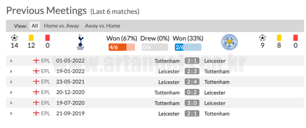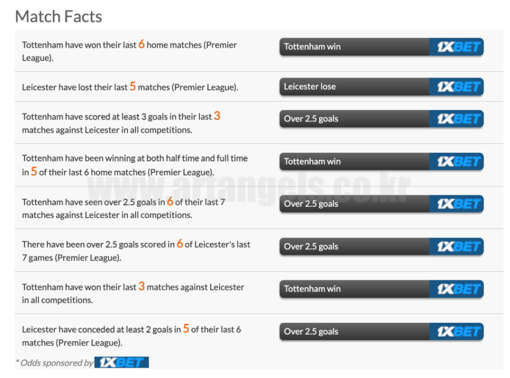토트넘은 레스터시티 상대로 7경기 중 6경기에서 2.5골 이상을 기록한 바가 있습니다.
