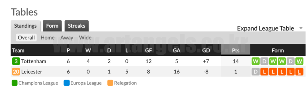 토트넘 홋스퍼는 리그 3위를 기록하고 있으며, 레스터시티는 현재 리그 20위를 기록하고 있습니다.