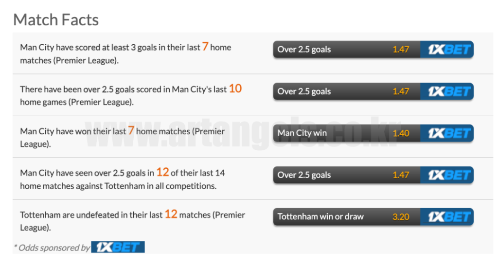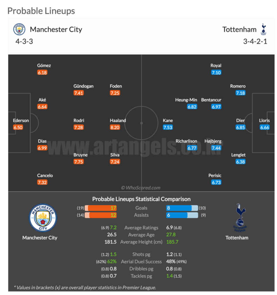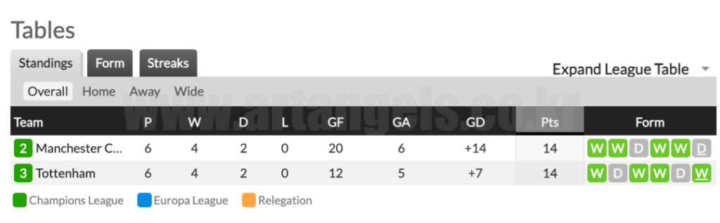 이번 경기가 흥미로운 이유는 맨시티와 토트넘은 승점이 동일합니다. 경기 결과에 따라서 리그 1위로 올라갈 수 있는 상황입니다.