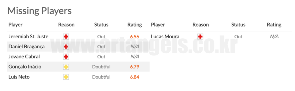 - 스포르팅은 Jeremiah St. Juste가 결석하고 Goncalo Inacio와 Luis Neto가 포르티모넨세와의 4-0 승리에서 쫓겨난 후 의심스러워 수비에 문제가 있습니다.