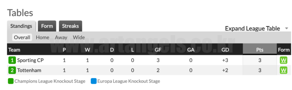 스포르팅은 챔피언스리그 1라운드에서 3:0 대승으로 인하여 조별리그 1등을 달리고 있으며, 그 뒤로 토트넘이이 2:0으로 승리하여 2위를 달리고 있습니다.