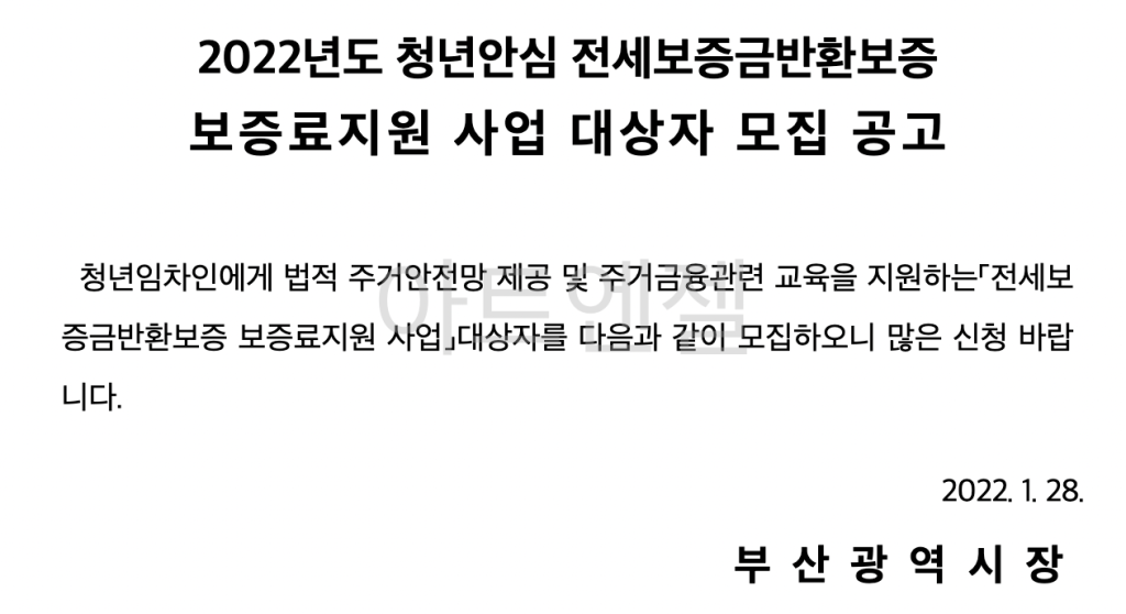 2022 부산 청년안심 전세보증금반환보증 제도에 대해서 한번 알아보겠습니다. 부산광역시에서는 청년임차인에게 법적 주거안전망 제공 및 주거금융관련 교육을 지원하는전세보증금반환보증 보증료지원 사업을 진행바가 있습니다. 22년 2월달에 사업을 시작했음에도 불구하고 현재까지 진행하는 것으로 보아 최대한 많은 청년에게 지원하는 것으로 보입니다. 끝까지 읽어보시고 꼭 도움이 되셨으면 좋겠습니다.