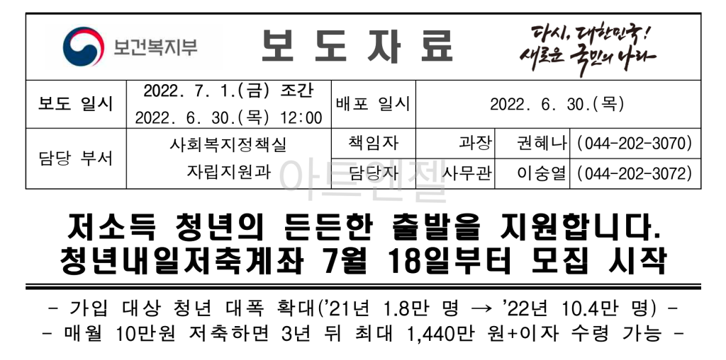 2022 청년내일저축계좌 신청 홈페이지에 대해서 한번 알아보겠습니다. 보건복지에서는 경제적으로 어려운 청년이 목돈을 마련하여 든든하게 사회 생활을 출발할 수 있도록 지원하기 위해 “청년내일저축계좌”를 도입하기로 결정했습니다. 21년도 1.8만명이었지만 22년는 10.4만명으로 늘려서 운영할 것으로 예상됩니다. 신청기간 및 조건에 대해서 자세하게 알아보겠습니다.