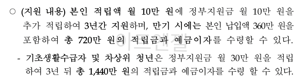 - 기초생활수급자 및 차상위 청년 대상자는 정부지원금 월 30만원을 적립하여 3년 뒤 1440만원의 적립금과 예금이자를 수령받습니다.
